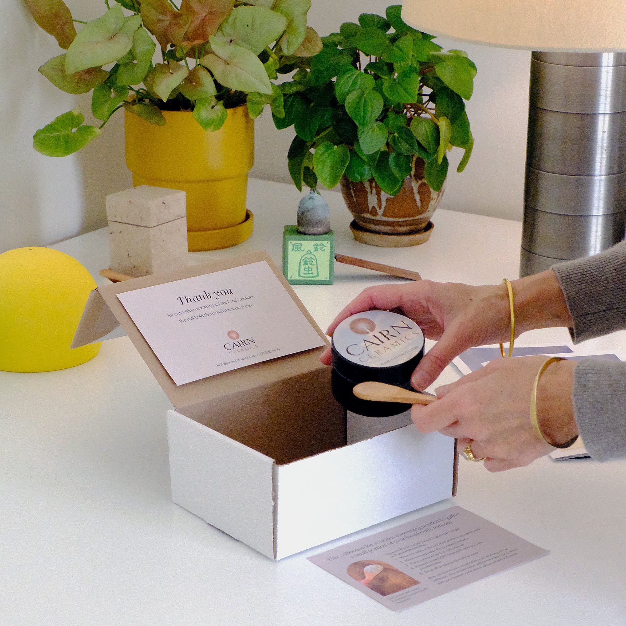 We ship the remains collection kit directly to your provider at no charge. They coordinate collection and return shipping using their preferred methods, and we deliver your finished memorial to you or your provider—all at no additional cost from Cairn Ceramics.